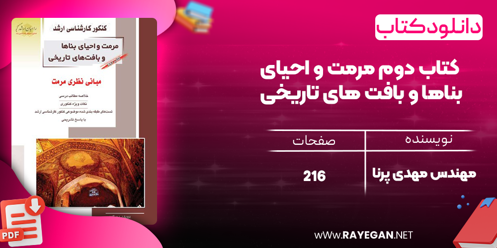 وب سایت فروشگاه رایگان پی دی اف کتاب دوم مرمت و احیای بناها و بافت های تاریخی یکی از آثار برجسته و معتبر در حوزه‌ ی مرمت و احیای بناهای تاریخی به شمار می‌ رود. این کتاب به طور جامع و عمیق به بررسی اصول و مبانی مرمت و احیای بناها می‌ پردازد و به دانشجویان، پژوهشگران و علاقه‌ مندان به این رشته، یک منبع ارزشمند و معتبر ارائه می‌ دهد. در سایت رایگان نت با ما همراه باشید.